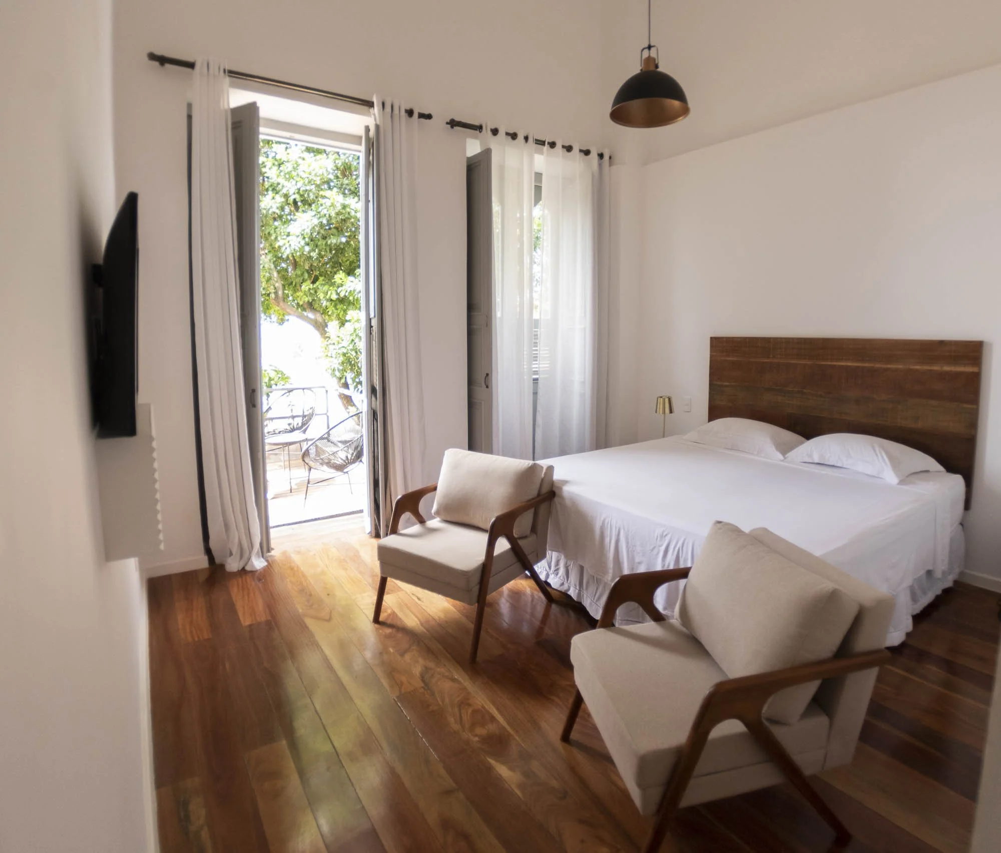 Com aproximadamente 88 metros quadrados a suíte Santa Teresa possui varanda e vista para o jardim do hotel, cama de casal king size, estação de trabalho, ar condicionado, tv e frigobar.