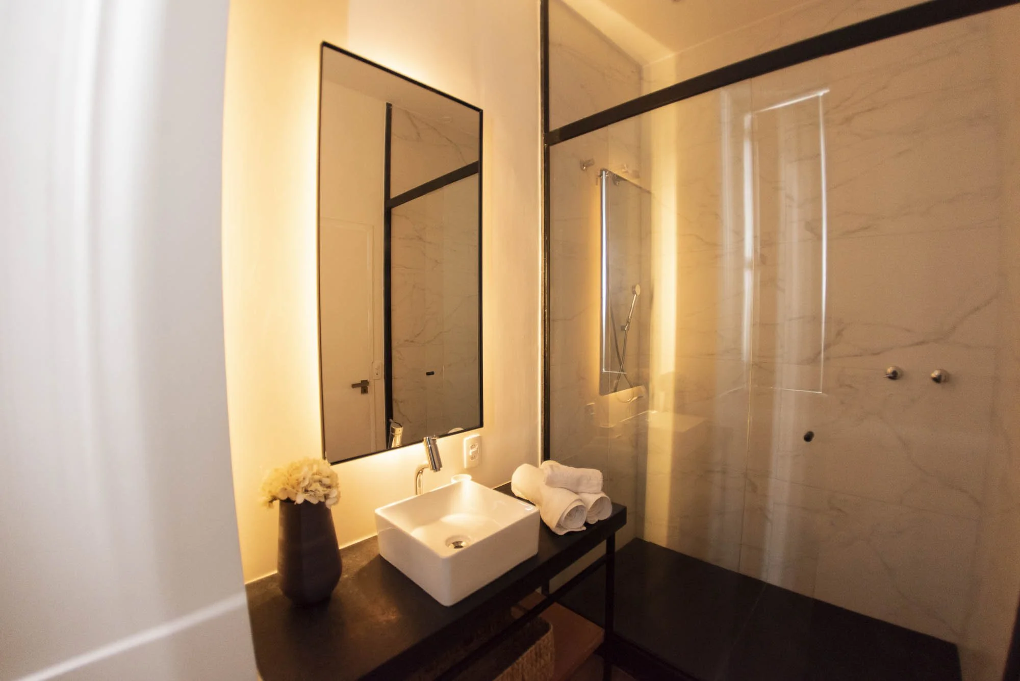 Com aproximadamente 50 metros quadrados a suite Gávea possui dois pavimentos com varanda e vista para o Centro do Rio de Janeiro, cama de casal king size, ar condicionado, tv e frigobar.